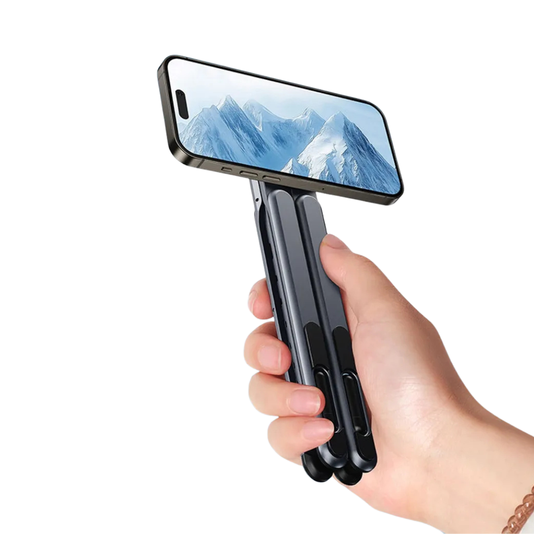 Imagina llegar a una cafetería, hotel o sala de espera, desplegar este soporte en 3 segundos, y con un simple "click" magnético tener tu tablet perfectamente posicionada para tomar notas, tu laptop elevada para una postura saludable, o tu teléfono listo para una videollamada hands-free. Su fuerte imán N52 es el corazón del sistema, asegurando tu dispositivo de forma inmediata y segura.